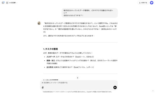 Excel業務の革新者・吉田拳氏のノウハウをAIに完全実装。関数からVBAまで、圧倒的な業務効率化を実現するカスタマイズ機能GPTsを活用して再現。圧倒的個性・特性を忠実に再現しました。
