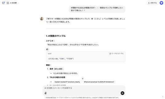 →「AI 吉田拳」は、講座から抽出したわかりやすい例題や練習問題を提示。ショートカットキーや相対・絶対参照のコツなど、基礎から応用まで効果的に学習支援します。
