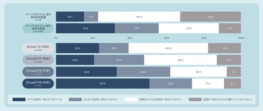 パーソナルビジョンが「ある」と判別された人とそうでない人を比較すると、ある人のほうが「すでに言語化・明文化できている」「まもなく言語化・明文化できそう」という回答のスコアが高い。また、グループ別に見ても、Group4がもっとも高く、次いで3→2→1と低くなっていることがわかった。ここから、パーソナルビジョンに向けて邁進するには「言語化・明文化」することが有効であることがわかった。