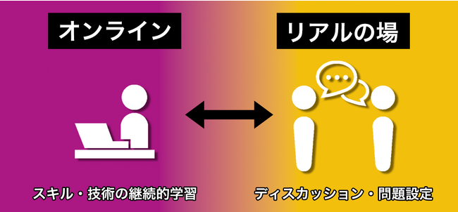 イノベーティブ人材の育成においては、技術やデザインは手段にすぎず、”価値のある問題”の設定ができることが重要であり、オンラインでの継続的なスキル学習とともに、ディスカッションを通じた多様な価値観の共有の場が非常に有効であると考えています