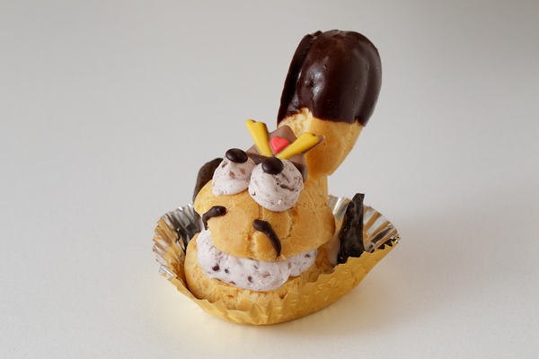 金シャチの形を模したシュークリーム、シャチボンが家康に変身。尾びれをちょんまげ風にし、味は名古屋らしく小倉クリームを使用。目玉の部分と口の中には名古屋らしく小倉クリームが。しっぽの先にはカスタードがたっぷり。