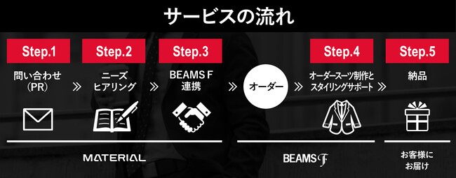 この取り組みは、原宿の店舗「BEAMS F」とマテリアルが提案するスタイリングを通じて企業のブランディング・PRを支援するBtoBサービスです。経営層・リーダー層が登壇する記者発表をはじめ、オフィス内外における商談や会議において最適な「スタイリング」「スーツ選び」「スーツの採寸・サイズ調整」を、「BEAMS F」のショップスタイリスト達がトータルプロデュースいたします。日々、企業活動において重要な意思決定を行う経営者・リーダーたちの「服装選びの時間的負担」「コーディネートのミスマッチ」といった質実両面のコストを軽減するとともに、一人ひとりの内面から溢れるパワーをスタイリングによって最大限表現することで、ご自身および企業イメージの向上を支援いたします。