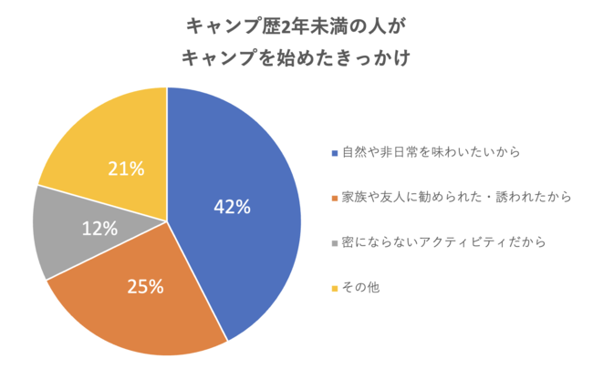 「キャンプ歴2年未満の人がキャンプに興味を持ったきっかけは?」という質問に対し、「自然や非日常を味わいたいから」と答えた人は回答者の42%にのぼりました。加えて、「密にならないアクティビティだから」と答えた人は12%という結果に。コロナ禍でキャンプを始めた人の半数以上は、密になることなく自然の中で非日常的な時間を過ごしたいという思いがきっかけでキャンプに興味を持ったことがうかがえます。