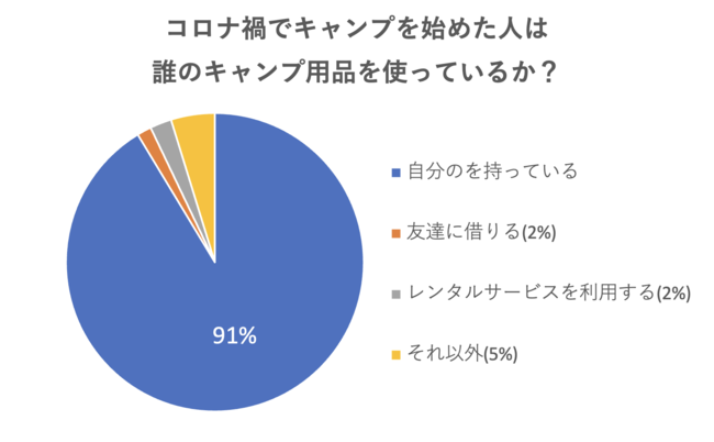 コロナ禍でキャンプを始めた人のうち、90%は自分のキャンプ用品を持って行っていると答えた。