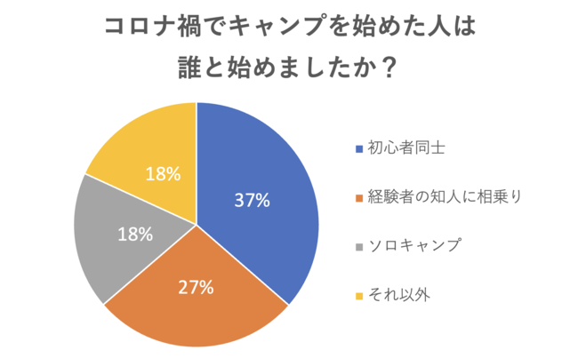 コロナ禍でキャンプを始めた人のうち、回答者の40%近くが初心者同士で始めたと答える結果に。
