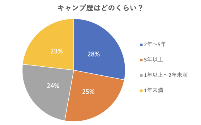 「キャンプ歴はどのくらいか」という質問に対し、「1年未満」あるいは「1年以上~2年未満」と答えた回答者の割合は47%にのぼった。