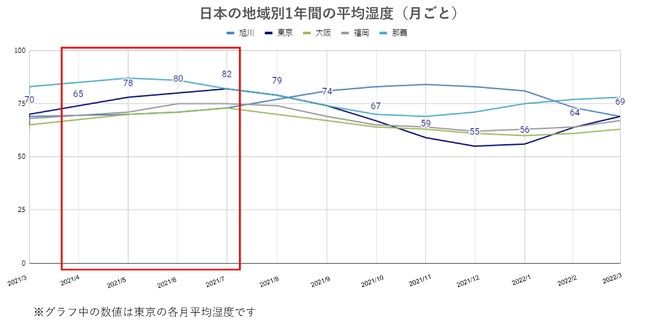 気象庁が発表する「過去の気象データ」※3から、年間の地域別平均湿度を見てみると、雨が多い春から夏にかけては、カビが一気に増殖しやすい湿度80%を超える時期となります。そのため、カビが発生しやすいこれからの季節、室内の湿度を知り対策することが快適に過ごすヒントといえるかもしれません。