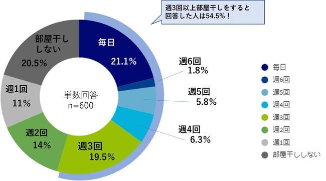 次に梅雨の時期の部屋干しの頻度を調査したところ、「毎日部屋干しをする」と回答した人は全回答者のうち21.1%で約5人に1人でした。また、梅雨の時期に部屋干しを「週3回以上する」と回答した人は全回答者のうち54.5% で約2人に1人いることがわかりました。