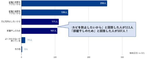 【直近1年で除湿機能を使った321人中139人が部屋の温度を下げるために除湿機能を利用すると回答!「部屋干しのため」や「カビを防止するため」という回答も】