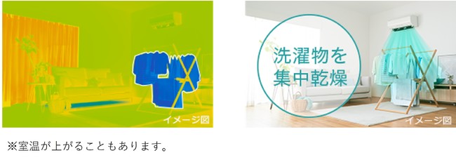 [くらしカメラ AI]の「湿度カメラ」機能で、部屋干しの洗濯物を見つけると、集中的に除湿して乾燥しやすくします。室温の低い時は暖房運転を組み合わせて運転します。