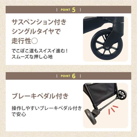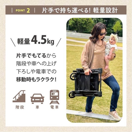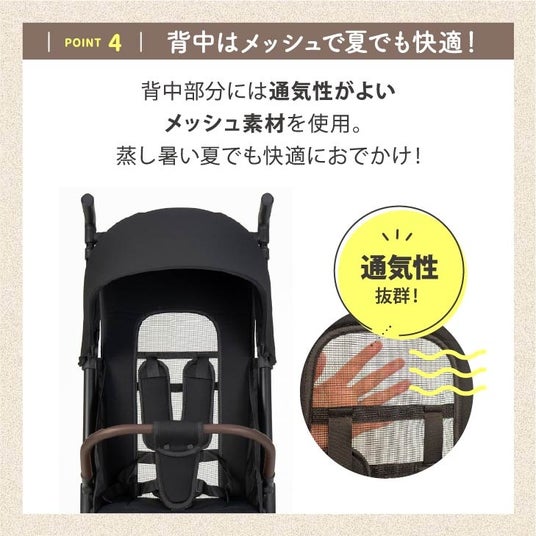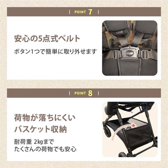 赤ちゃんとのお出かけの機会が増える7か月以降、大きくて重いベビーカーでは移動が大変。そんな家族にぴったりのベビーカー。軽量だけどしっかり構造なので押しやすく快適に移動ができます。