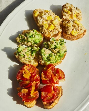 ◆ブルスケッタ:コーンとツナのブルスケッタ/ブロッコリーとツナのブルスケッタ/トマトとオニオンのブルスケッタ