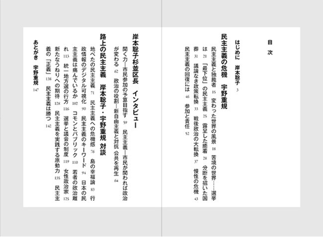ヨーロッパでの市民活動をへて2022年7月、東京都杉並区初の女性区長となった岸本聡子氏。草の根で民主主義を実践する岸本氏と、東大教授で「民主主義」研究の第一人者として知られる政治学者の宇野氏が初対談しました。ロシアによるウクライナ侵攻、安倍晋三元首相の暗殺に端を発して明るみに出た政治の旧統一教会への依存など、国内外のニュースを踏まえて現代の「民主主義の危機」を解説した宇野氏講演や、杉並区長就任直後の岸本氏インタビューも収録。「多数決」や「選挙」といった従来の観点からとは異なる「新しい民主主義」の姿が見えてくる1冊です。