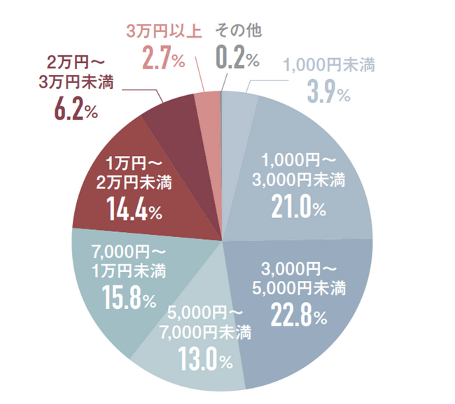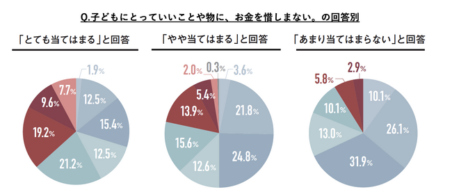 全体で多かった回答が「1,000円~3,000円未満」が21.0%、「3,000円~5,000円未満」が22.8%、「7,000円~1万円未満」が15.8%となりました。また子どもに対し月に1万円以上使用しているのは23.3%となりました。こちらの回答を「Q.子どもにとっていいことや物に、お金を惜しまない」の回答ごとにみてみると、「とても当てはまる」と回答した人が1万円以上使用している割合が36.5%と10%ほど多くなる結果となりました。