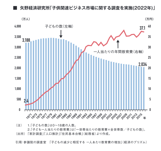 厚生労働省の発表によると2022年の国内の出生数(速報値)は前年比 5.1%減の79万9728人と、過去最低を記録しています。急速な少子化の一方で、国内子ども関連ビジネス市場は堅実に成長を続けており、2020年度はコロナ禍でいったん減少したものの2022年度にはコロナ前の市場規模にまで回復する見込みです。また、参議院の調査室によると、子どもの数が減少しているのに反して子ども一人当たりの年間教育費は年々上昇、年間教育費はこの30年で10万円以上も増加していることがわかります。キッズ市場は6ポケット市場(子ども1人に対して、両親と祖父母の合計6人の財布が潜在している)ともいわれ、少子化においても成長が期待できる市場といえるでしょう。