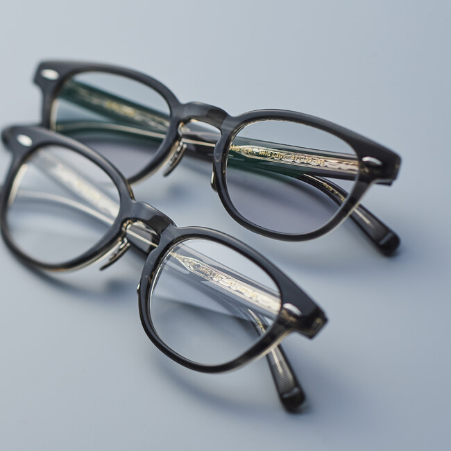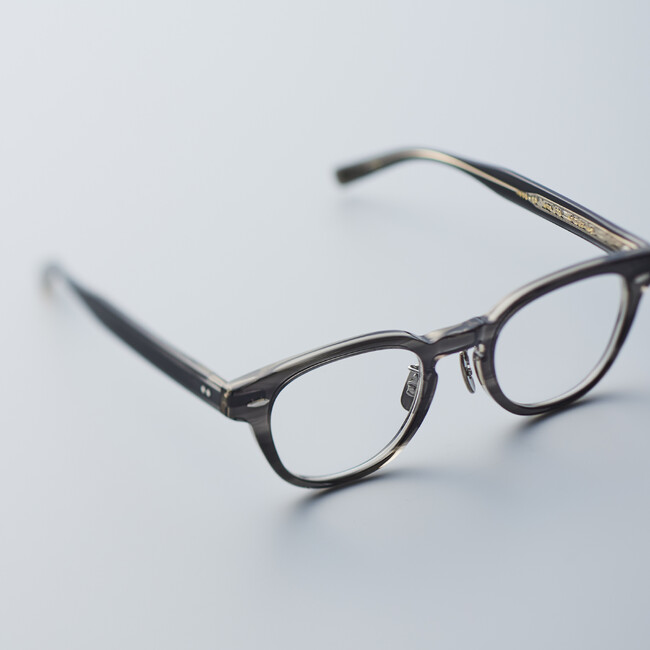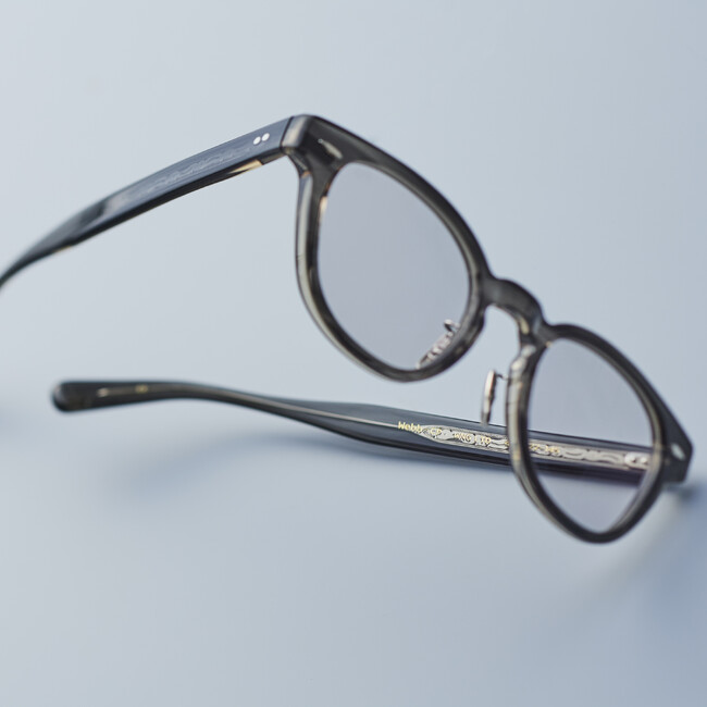 EYEVANを代表するモデルWebbは、クラシックカーのパーツからインスパイアされた柄が表裏に彫り込まれているオリジナルテンプル芯が特徴。フレームカラーに2023SSから新登場し瞬く間に人気色となった「WNG(WENGE:ウェンジ )」を採用し特注生産。 名称の由来となったウェンジは、家具や内装材に使用する高級な木材で「1 枚の板」として使用するからこそ美しさを味わうことができると言われています。表面にグレーササ、裏面はクリアーのアセテート生地を貼り合わせているようにも見えるEYEVANのWENGEも、実際は「1枚の生地」となっており奥行のある色使いと美しさが表現されています。