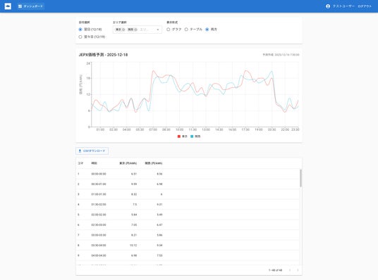 これまでAPI経由で取得していた予測データを、グラフや表形式で視覚的に表示。専門的な開発スキルがなくても、翌日の価格予測推移を一目で把握でき、日々の運用判断に即座に活用いただけます。