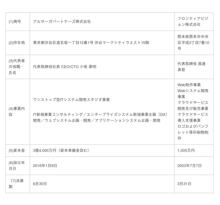 「日本全国のDX(デジタルトランスフォーメーション)事業を成功させること」をミッションとし、ワンストップ型ITシステム開発スタジオ事業を展開するアルサーガパートナーズ株式会社(本社:東京都渋谷区、代表取締役社長 CEO/CTO:小俣 泰明、以下「当社」または「アルサーガパートナーズ」)は、2021年8月6日を効力発生日とし、当社を存続会社として、熊本県No.1の制作実績を誇るWeb制作会社のフロンティアビジョン株式会社(本社:熊本県熊本市、代表取締役:渡邉 直登 以下、「フロンティアビジョン」)を吸収合併消滅会社とする吸収合併を行ったことをお知らせいたします。