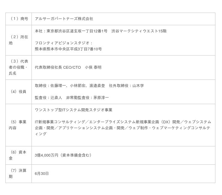 今後当社は、新生「アルサーガパートナーズ」として、東京と同様に、熊本県を九州地方のDXビジネスにおける重要拠点として定め、事業および雇用を拡大していきます。また、吸収合併消滅会社であるフロンティアビジョンの商号は、今後も「アルサーガパートナーズ株式会社 フロンティアビジョンスタジオ」として持続いたします。