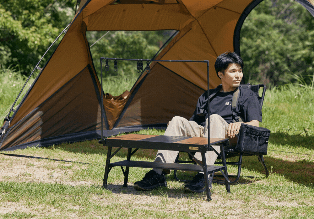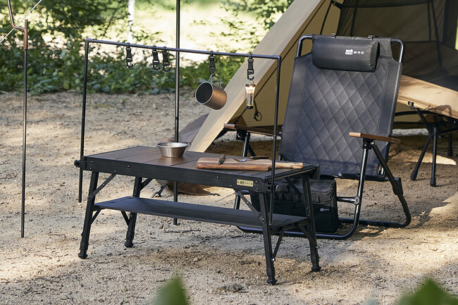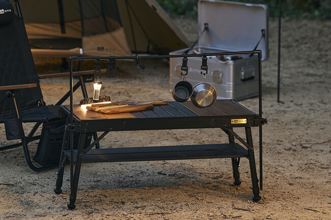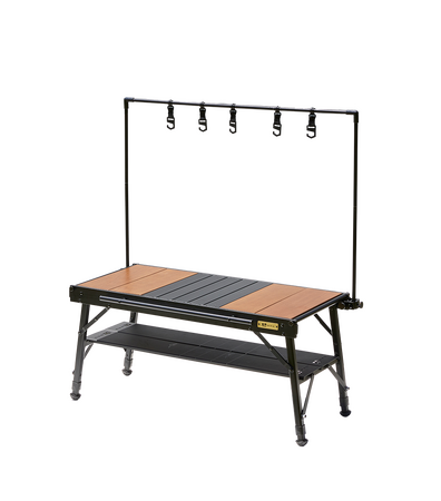 本製品は、3段階の高さ調整、パネル式のウッド天板とアルミ天板を採用、テーブル下のデッドスペースを解消するシェルフボードが特徴なロースタイルのキャンプにぴったりな多機能テーブルです。ユーザー様のスタイルに合わせて拡張が可能なハンガーラックやランタンハンガーも装備することで、テーブル周りのスペースをお好きにカスタム可能です。