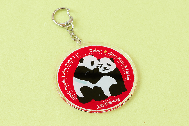 一般公開を記念して、恩賜上野動物園の双子パンダをモチーフにしたアクリルキーホルダーを作りました。仲良くじゃれあう双子パンダの絵柄と、一般公開の記念日入り。シャオシャオの背中には目印の緑のラインが入っており、いまならではの可愛さを忠実に表現しました。