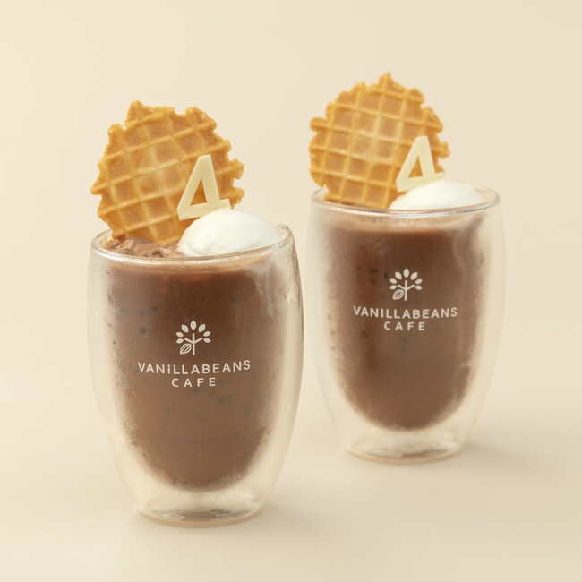 エクアドル産カカオを使用した当店人気の冷たいビターチョコレートドリンクに、チョコレートとの相性を考えさっぱりとした口当たりの自家製のバニラアイスと、「4周年」を祝う数字型チョコレート、ワッフルチップをトッピングしました。程よいカカオの風味と、アイスクリームによるマイルドな味わいへの変化もお楽しみいただけます。