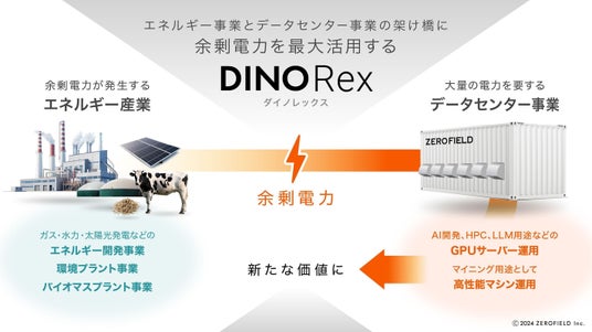2024年7月29日(月)株式会社ゼロフィールド(本社:東京都港区、代表取締役CEO:平嶋 遥介、以下ゼロフィールド)は、エネルギー産業における余剰電力の有効活用を目的に、コンテナ型データセンター『DINO Rex』の提供を開始することをお知らせいたします。