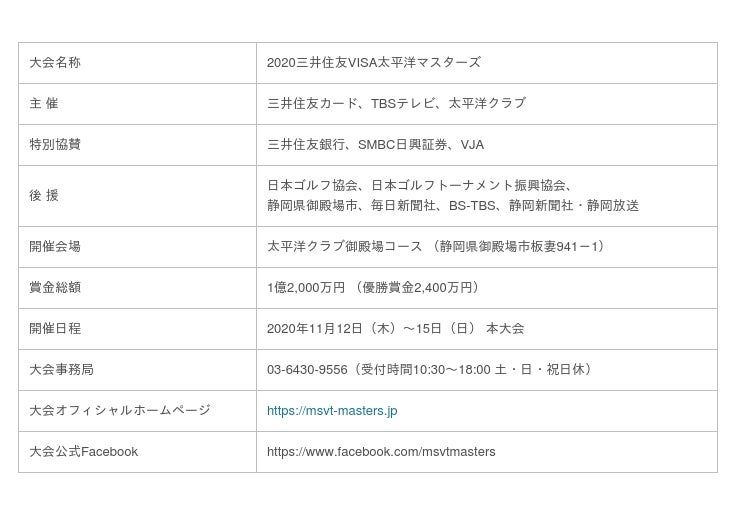 三井住友カード株式会社(本社:東京都港区、社長:大西 幸彦、以下:三井住友カード)、株式会社TBSテレビ(本社:東京都港区、社長:佐々木 卓、以下:TBSテレビ)、株式会社太平洋クラブ(本社:東京都港区、社長:韓 俊、以下:太平洋クラブ)の3社は、一般社団法人日本ゴルフツアー機構(本社:東京都港区、会長:青木 功、以下:JGTO)主管の元、男子ゴルフトーナメント「2020三井住友VISA太平洋マスターズ」を、太平洋クラブ御殿場コース(静岡県御殿場市)にて2020年11月12日(木)から15日(日)の4日間開催いたします。