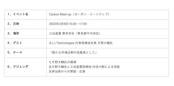 三谷産業株式会社(本社:石川県金沢市/代表取締役社長:三谷 忠照、以下 三谷産業)は、3月9日、三谷産業 東京本社(東京都千代田区)にて、世界で初めて実用型ホバーバイクを開発した株式会社A.L.I.Technologies(本社:東京都港区、以下 A.L.I.Technologies)の代表取締役社長である片野大輔氏をゲストに迎え、社内向けトークイベント「Carbon Meet-up」を開催しました。