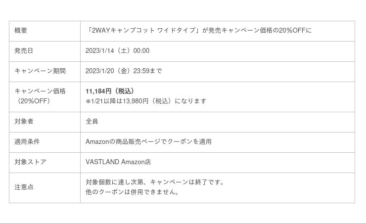 VASTLAND株式会社(本社:兵庫県姫路市/代表:田中悠貴)は、コット幅75cmの幅広設計でゆったり眠れる「2WAYキャンプコット ワイドタイプ」を2023/1/14(土)にAmazon店で先行発売することを決定しました。また発売を記念して、Amazon店限定で20%OFFの価格で購入できる「発売キャンペーン」を【初回生産分500個限定】で開催します。