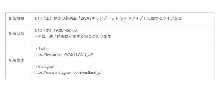 1/12(木)19:00より「2WAYキャンプコット ワイドタイプ」に関するライブ配信をVASTLAND公式Twitter・Instagramアカウントで開催します!