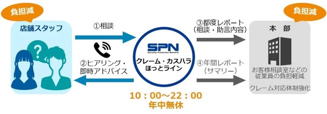 企業の危機管理を総合的に支援する株式会社エス・ピー・ネットワーク(本社:東京都/代表取締役社長:熊谷信孝)は、2022年6月1日(予定)から店舗、事業所向け電話相談窓口『クレーム・カスハラほっとライン』を提供開始します。店舗のクレーム・カスタマーハラスメント・事件・事故に関して店舗責任者をはじめ、パートやアルバイトを含む全従業員が相談可能です。対応時間は10:00~22:00、年中無休で対応いたします。価格は1法人定額10万円/月(消費税抜き)。店舗数や相談件数に制限はありません。