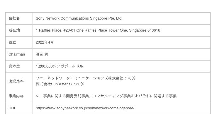 株式会社Sun Asterisk(代表取締役:小林泰平/本社所在地:東京都千代田区、以下「Sun*」)とソニーネットワークコミュニケーションズ株式会社(代表取締役 執行役員社長:渡辺潤/本社所在地:東京都品川区、以下「ソニーネットワークコミュニケーションズ」)は、NFT(Non-Fungible Token:非代替性トークン)に関する開発受託事業、コンサルティング事業を行う 『Sony Network Communications Singapore Pte. Ltd.』をシンガポールに設立しました。