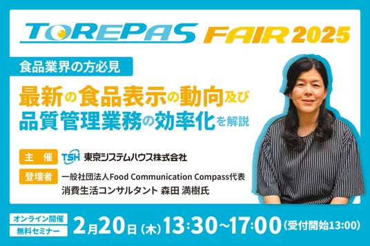 ITサービスの提供を行う東京システムハウス株式会社(本社:東京都品川区、代表取締役:林知之、以下当社)は、食品メーカー向けに最新の食品表示の動向及び、品質管理業務の効率化を解説するセミナーを2025年2月20日(木)13:30~17:00に開催します。セミナーでは、消費者庁 食品表示懇談会 委員 消費生活コンサルタントとしてご活躍されている森田氏をお迎えし、食品表示のこれまでの経緯・実証実験・コーデックスガイドラインなどの最新情報についてお話しいただきます。