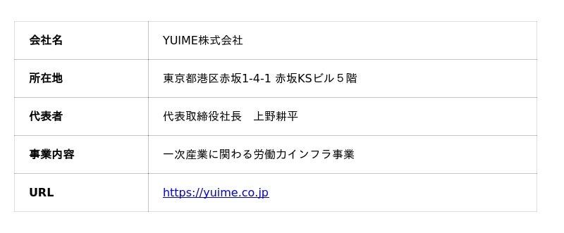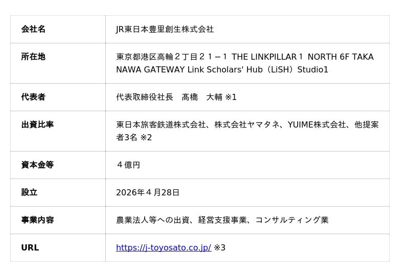 YUIME株式会社(代表取締役社長:上野耕平、本社:東京都港区、以下「YUIME」)は、東日本旅客鉄道株式会社(代表取締役社長:喜勢 陽一、本社:東京都渋谷区、以下「JR東日本」)が設立発起人となった新会社「JR東日本豊里(とよさと)創生(そうせい)株式会社」(東京都港区、代表取締役社長:高橋 大輔、以下「JR東日本豊里創生」)に株式会社ヤマタネ(代表取締役社長:河原田 岩夫、本社:東京都江東区、以下「ヤマタネ」)と共に出資参画いたします。農業人材インフラ企業として、人材の供給と農業法人への就労支援を担うパートナーとして、同社の創業に加わります。