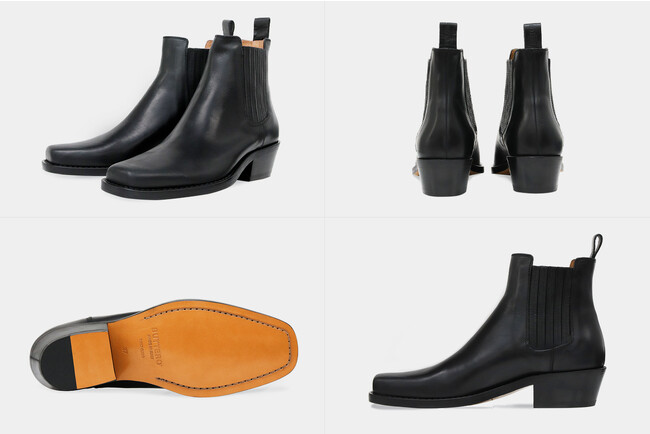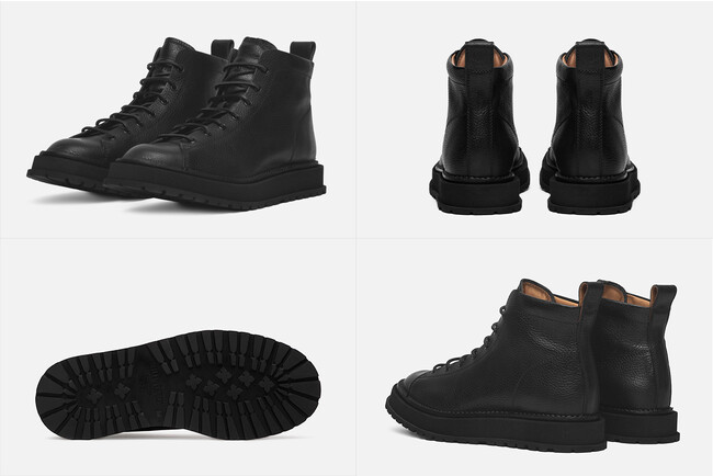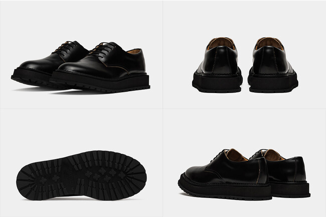 最高級のフルグレインレザーをアッパーに使用し、存在感のあるラグジュアリーなモデル。丁寧にハンドステッチされた太めのステッチと、革巻きされたミッドソール+ラバーアウトソールでダブルソールが、モード感あふれるデザインになっています。