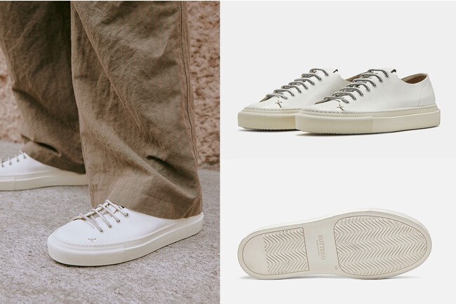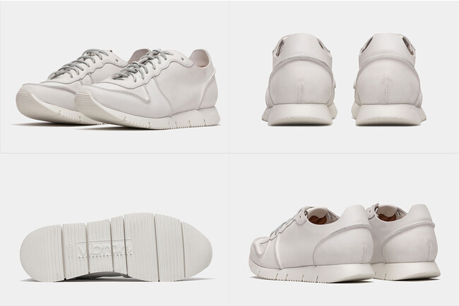 牛革の中で最高級の質を誇るベビーカーフをアッパーに使用、ソールは40mmのMARGOM社。光沢あるレザーは高級感があり、ヒールカップの部分にクッションを配して足に優しく、フィット感も抜群です。シンプルなスニーカーながら履き心地や質にもこだわりを感じられるつくりとなっています。