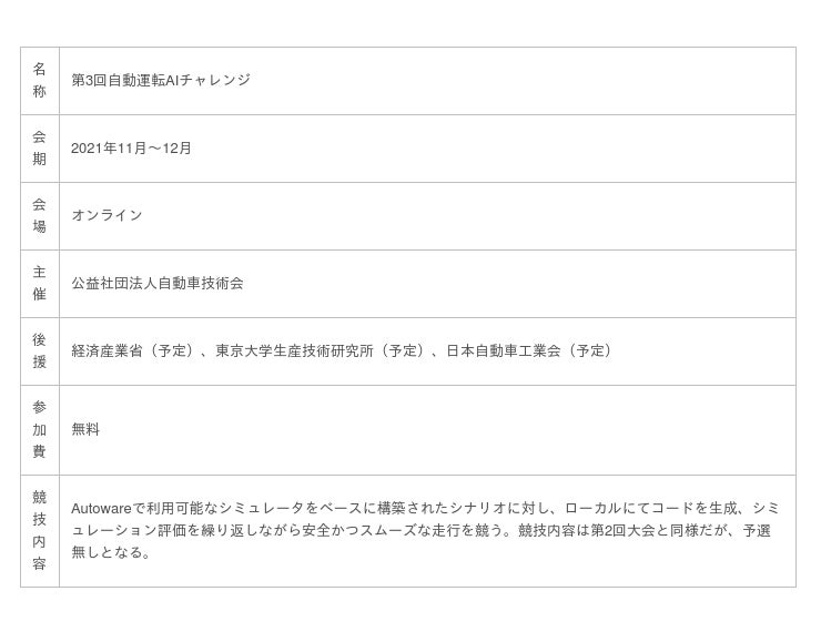 公益社団法人 自動車技術会(会長 寺師 茂樹)は、2021年11月~12月にオンラインにて、第3回自動運転AIチャレンジを開催します。