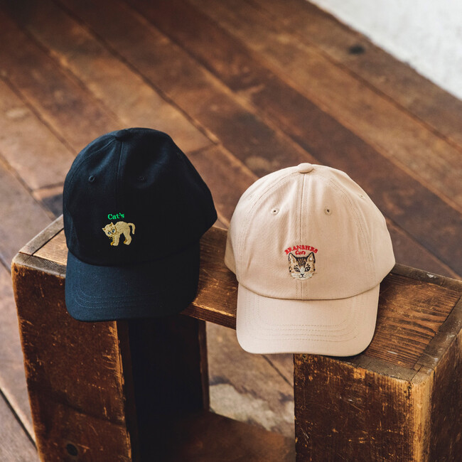 くりっとした目がかわいいフェイスデザインと、躍動感のある子ネコの全身デザインの2種類の刺繍をご用意。【Cat's ISSUE】ネコ刺繍キャップ S/M/L ¥3,300 taxin