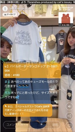 ブランシェスのECサイト内からアプリやアカウント不要で誰でも視聴することのできる《branshesライブショッピング》でもコラボ配信を実施。こちらもCat’s ISSUE代表の太田メグさんをゲストに迎え実際の店頭接客のような配信に。細かいディテールやコーディネートなど気になるポイントをコメントで聞くことができ、そのままカートインして購入することができる。