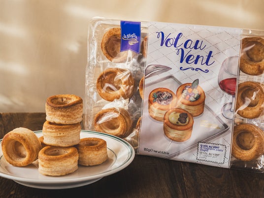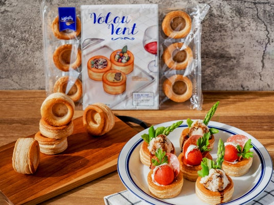 時短で一品《詰めて焼くだけ》ラ スフォーリアのパイケース〈ボローバン〉は、あらかじめ成型、焼成されているので、パイ生地を作る必要がなく、お好みの食材を詰めて焼く、もしくは軽く焼いてから中に食材を詰めるだけでパイメニューが一瞬でできてしまうというクリスマスなどイベントが続くパーティーシーズンにはぴったりのアイテムです。