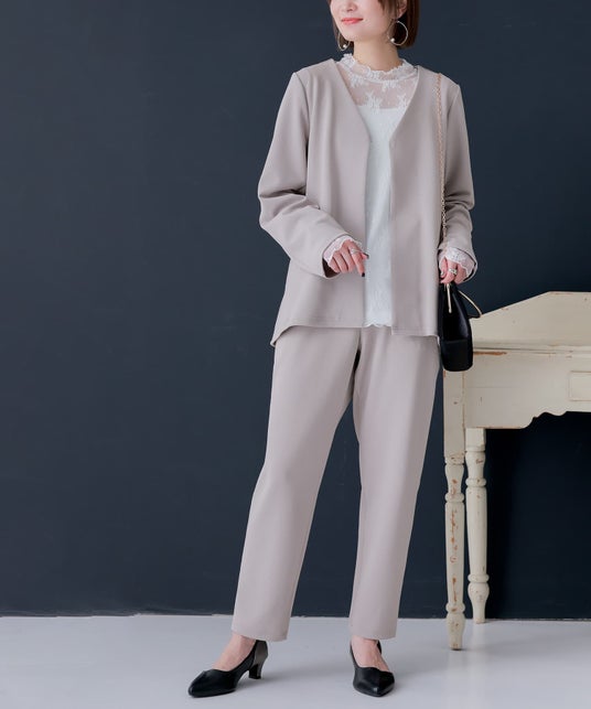 様々なインナーと合わせやすいノーカラージャケット×すっきりとしたテーパードパンツのセットアップ。