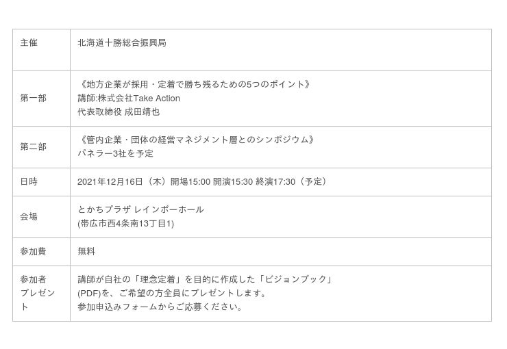 採用支援・HR Tech 事業を行う株式会社Take Action(本社:東京都品川区、代表取締役社長:成田靖也)は、2021年12月16日(木)に開催される北海道十勝総合振興局様主催のセミナーに登壇いたします。ぜひ、皆様のご参加を心よりお待ちいたしております。