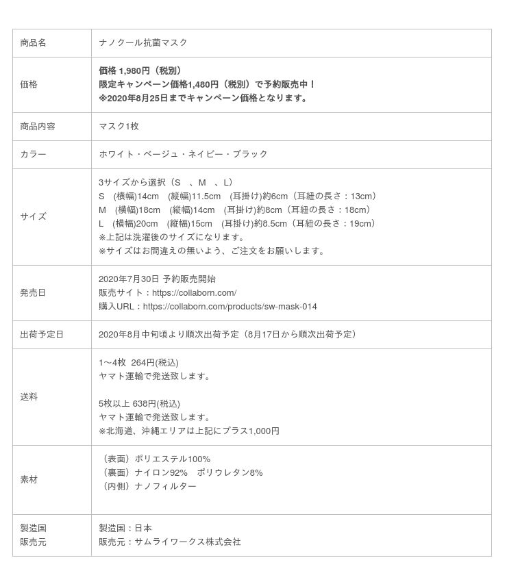 サムライワークス株式会社(代表取締役:新島 実 本社所在地:東京都渋谷区)は、超高機能、究極の夏マスク「ナノクール抗菌マスク」を8月下旬より全国量販店で販売開始いたします。