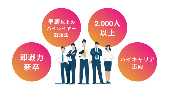 大学生時代から弊社サービスを通じて、将来のビジョンやキャリアゴールを踏まえ、最適なキャリアプランなどに向き合っているハイキャリア志向を持つ学生が集います。