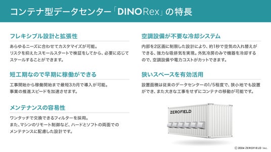 2024年7月29日(月)、株式会社トリプルアイズ(本社:東京都千代田区、代表取締役:山田 雄一郎、東証グロース市場《証券コード:5026》、以下トリプルアイズ)は、グループ会社である株式会社ゼロフィールド(本社:東京都港区、代表取締役CEO:平嶋 遥介、以下ゼロフィールド)が、エネルギー産業における余剰電力の有効活用を目的に、コンテナ型データセンター『DINO Rex』の提供を開始することをお知らせいたします。