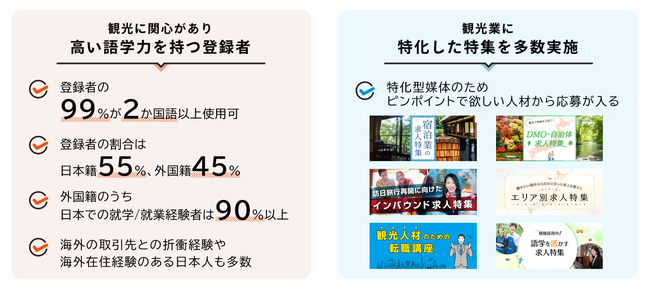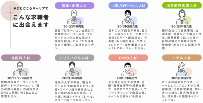 「やまとごころキャリア」は観光・インバウンドの仕事に特化した求人サイトです。25,000人の登録会員の多くが、観光・インバウンド業界に強い関心を持ち、これまでの経験や語学力を活かして観光・インバウンド業界に貢献したいという高い志を持っています。