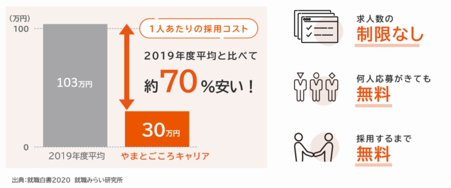 サービス最大の特徴は「成果報酬型」の料金体系です。求人掲載件数やスカウト数は無制限で、採用成功までは費用が発生しないため、リスクなく採用活動をスタートいただけます。成果報酬費用は、正社員・契約社員採用の場合1名あたり30万円(税別)、アルバイト採用の場合1名あたり10万円(税別)となっております。