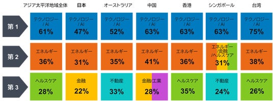 地政学的緊張は短期的な市場のボラティリティを高める一方で、長期的かつ構造的な成長トレンドを見極める重要性を改めて浮き彫りにしています。なかでも、テクノロジーおよびAI分野は、日本を含むアジア太平洋地域のすべての市場において、最も有望な投資分野として認識されています。今後12カ月間で高い投資利回りが見込めると回答した投資家はアジア太平洋地域全体では61%、日本でも47%に達し、エネルギー(31%)や金融(22%)を上回りました。