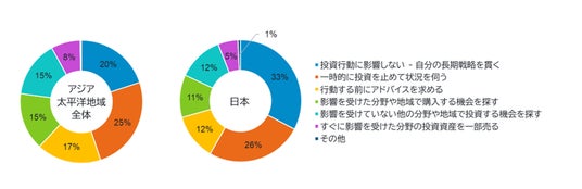 さらに、市場の変動を投資機会と捉える投資家も少なからず存在することがわかりました。アジア太平洋地域では15%が、ボラティリティの影響の大きい分野や地域での投資を積極的に検討しており、同じく15%が影響を受けにくいと考える他分野への資金配分を検討しています。日本でもアジア太平洋地域全体と比較すると割合は低いものの、それぞれ1割超(前者が11%、後者が12%)が市場のボラティリティを投資の好機と捉えています。
